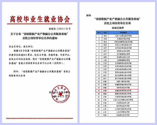 2025年,我院成功入选“省级数据产业产教融合公共服务基地”首批立项培育单位。该基地建设将聚焦大数据、人工智能等前沿领域,开展技术研发、人才培养、社会培训等服务,助力安徽省数字经济发展和产业转型升级。