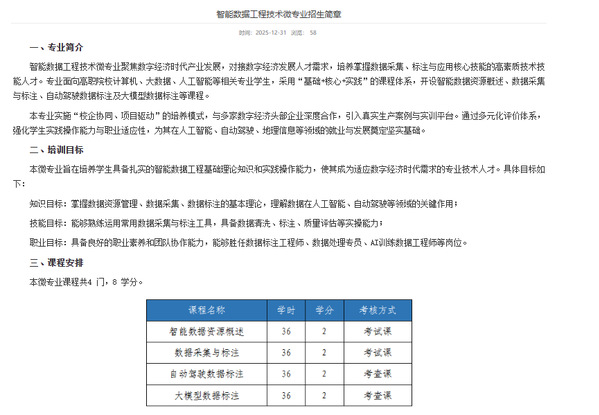 为适应新技术、新业态发展需求,我院积极创新人才培养模式,紧扣产业需求,通过校企合作面向全校学生开设“智能数据工程技术”微专业。帮助学生拓展知识结构,提升就业竞争力。