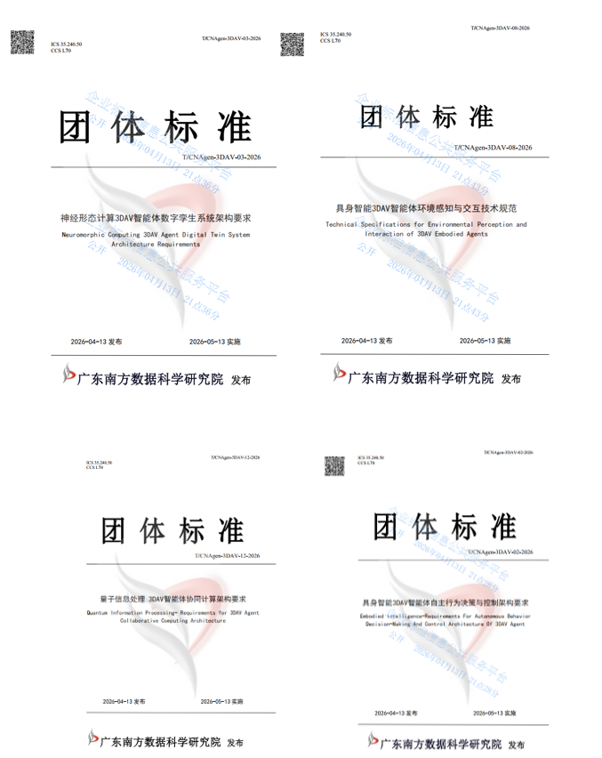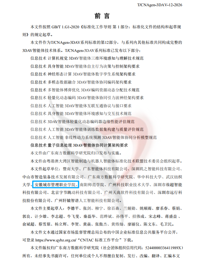 近日,由广东南方数据科学研究院归口发布的T/CNAgen-3DAV具身智能团体标准正式公布,我院成功参编其中四项核心标准,成为全国唯一参与该系列标准起草工作的高等职业专科院校,标志着学院在人工智能领域的技术实力与行业影响力再获权威认可。